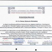 Podziękowanie za objęcie koordynacją polskiego tłumaczenia oraz adaptacji platformy e-learningowej “Copyright for Librarians”, będącej częścią projektu Berkman Center for Internet & Society (Harvard University) oraz Elektronicznej Informacji dla Bibliotek (eIFL), konsorcjum bibliotek z 50 krajów w Afryce, Azji i Europie