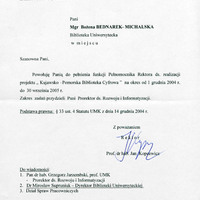 Powołanie do pełnienia funkcji Pełnomocnika Rektora ds. realizacji projektu “Kujawsko-Pomorska Biblioteka Cyfrowa” na okres od 1 grudnia 2004 r. do 30 września 2005 r.