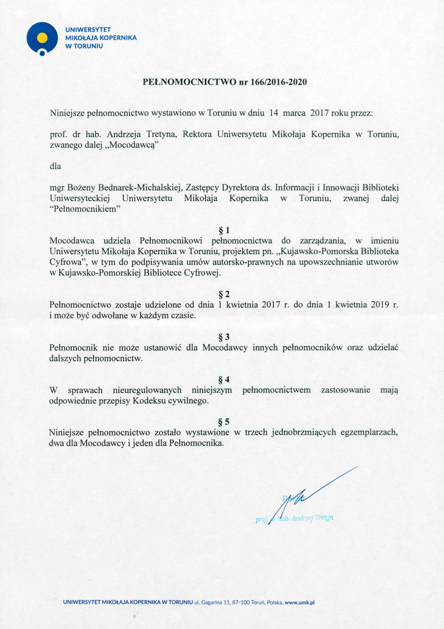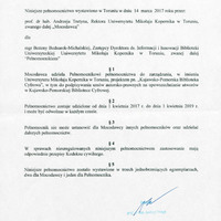 Powołanie do pełnienia funkcji Pełnomocnika Rektora do zarządzania projektem “Kujawsko-Pomorska Biblioteka Cyfrowa”, w tym do podpisywania umów autorsko-prawnych na upowszechnianie utworów w Kujawsko-Pomorskiej Bibliotece Cyfrowej na okres od 1 kwietnia 2017 r. do 1 kwietnia 2019 r.