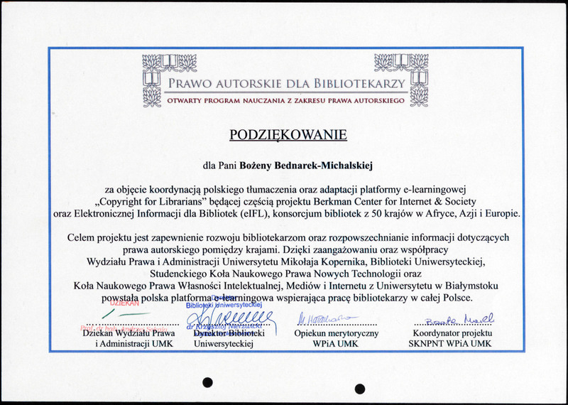 Oprócz tego działała w międzynarodowym ruchu Open Access Movement od podpisania Deklaracji Berlińskiej (2002 r.). Reprezentowała również Polskę w organizacji Electronic Information for Libraries (EIFL) od 2008 r. W ramach EIFL uczestniczyła m.in. w kampanii „Open access advocacy campaign in EIFL partner countries to reach out to research communities”, a w latach 2012-2013, we współpracy z EIFL oraz kołami naukowymi studentów prawa UMK i Uniwersytetu w Białymstoku (UwB), przygotowała także kurs e-learningowy "Prawo autorskie dla bibliotekarzy".