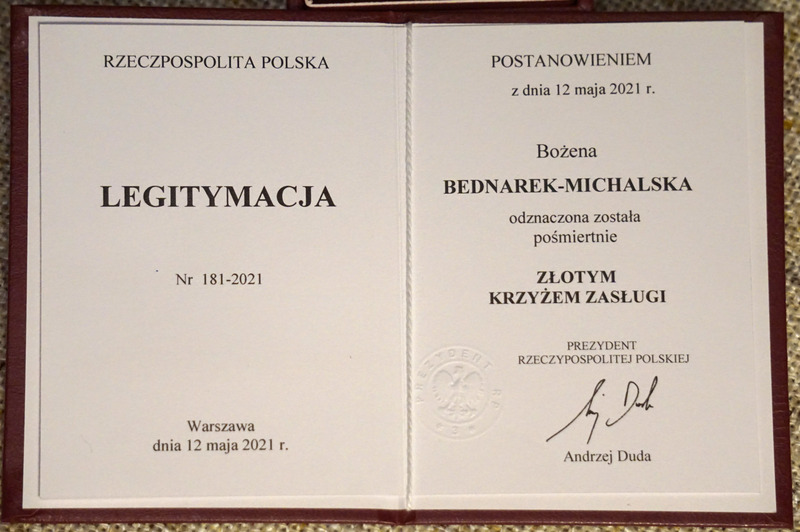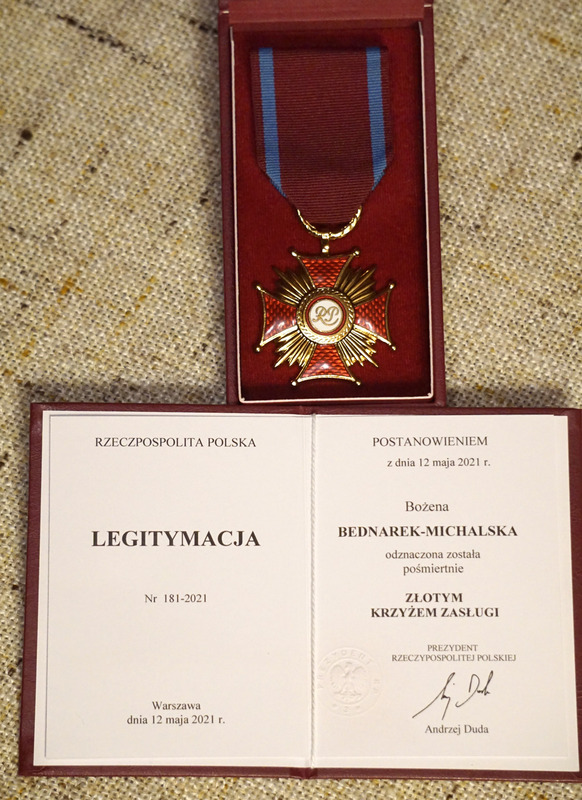 Zwieńczeniem dokonań Bożeny Bednarek-Michalskiej było pośmiertne odznaczenie jej 12 maja 2021 r. przez Prezydenta Rzeczypospolitej Polskiej Złotym Krzyżem Zasługi za zasługi w działalności na rzecz rozwoju bibliotekarstwa. W dniu pogrzebu, na cmentarzu Najświętszego Serca Pana Jezusa w Bydgoszczy, Wicewojewoda Kujawsko-Pomorski Józef Ramlau złożył to odznaczenie na ręce męża – Miłosza Michalskiego.