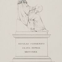 Rycina przedstawia pomnik Mikołaja Kopernika w Warszawie usytuowany przed fasadą Pałacu Staszica. Pomnik autorstwa duńskiego rzeźbiarza klasycystycznego Bertela Thorvaldsena. Odsłonięcie monumentu nastąpiło 11 maja 1830 r. Astronom siedzący na postumencie w lewej dłoni trzyma astrolabium,