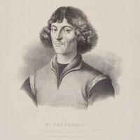 Wizerunek Mikołaja Kopernika według toruńskiego portretu astronoma z końca XVI w., przechowywanego przez lata w Gimnazjum Akademickim. Kopernik ukazany od pasa w górę, zwrócony w prawo. Litografia francuskiego rytownika Pierra Rocha Vigneron z lat trzydziestych XIX w., wykonana w zakładzie Engelmanna w Paryżu.