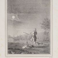 Grafika ukazująca mężczyznę prowadzącego obserwacje Księżyca za pomocą lunety. Postać w stroju XVIII-wiecznym z lewą nogą opartą na kamieniu, z prawej pies. Z lewej strony luneta na trójnogu, u dołu zarys bliżej nieokreślonej mapy. Księżyc w pełni. W tle zabudowania z charakterystycznym włoskim pejzażem z dostrzegalnymi smukłymi cyprysami. Scena podpisana błędnie: „Copernico in osservazione”. Kopernik podczas pobytu we Włoszech nie mógł posługiwać się lunetą, gdyż jeszcze jej wówczas nie wynaleziono. Ponadto mężczyzna ubrany w charakterystyczny dla XVIII-wiecznego stroju pończochy i płaszcz, z lewej u boku szpada.