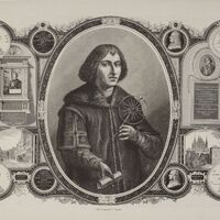 Bogata kompozycja dedykowana pamięci Mikołaja Kopernika związana z jubileuszem 400. rocznicy urodzin astronoma w 1873 r. W partii centralnej, w owalu, reprodukcja obrazu przypisywanego Ghirlandaio (Ridolfi di Domenico) w opracowaniu Franciszka Tegazzo. W rogach kilka medali pamiątkowych. Ponadto portrety i tablice z nagrobków w Toruniu (z lewej) i Fromborku (z prawej). Widoki miejsc związanych z uczonym, uznawana w XIX w. za dom urodzin Kopernika kamienica na rogu ul. Św. Anny i Piekary (z lewej) oraz Baszta Kopernika we Fromborku (z prawej). Napisy: „A REGULSKI S.C.” – w lewej dolnej części portretu (sygnatura rytownika); „FT.” – w prawej dolnej części (monogram autora rysunku); „Układ i rysunek F. Tegazza” - pod kompozycją.