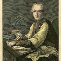 dłoni. Obok z prawej strony postaci ukazana sfera armilarna – przyrząd astronomiczny służący astronomom