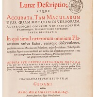 Johannis Hevelii Selenographia: Sive, Lunae Descriptio; Atque Accurata, Tam Macularum Ejus, Quam Motuum Diversorum, Aliarumque Omnium Vicissitudinum, Phasiumque, Telescopii Ope Deprehensarum, Delineatio. In qua simul caeterorum omnium Planetarum nativa facies, variaeque observationes, praesertim autem Macularum Solarium ... sub aspectum ponuntur ... Addita Est, Lentes Expoliendi Nova Ratio, Ut Et Telescopia Diversa Construendi, Et Experiendi, horumq[ue]. adminiculo, varias observationes Coelestes, inprimis quidem Eclipsium, cum Solarium, tum Lunarium ... perspicue explicatur