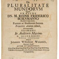 Disputatio Philosophica De Pluralitate Mundorvm / Quam Præside Dn. M. Reinh. Friderico Bornmanno Profess. Publ. Ordin. Fautore ac Studiorum suorum Promotore ætatem colendo, devenerando, Thorunii In Auditorio Maximo D. [ ] Julii A. O. R. M. DCCXV. Publicæ ventilationi subjicit Johannes Wilhelmus Weinreich Mariæb. Pruss. Avtor Et Respondens