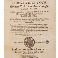 Tabulae Rudolphinae, Quibvs Astronomicae Scientiae, Temporum longinquitate collapsae Restauratio continetur A Phoenice illo Astronomorum Tychone, Ex Illustri&-Generosa Braheorum in Regno Daniae familia oriundo Equite, Primum Animo Concepta Et Destinata Anno Christi MDLXIV: ... tracta per annos XXV, ... Tandem Traducta In Germaniam, In Que Aulam Et Nomen Rudolphi Imp. anno MDIIC. Tabulas Ipsas, Iam Et Nuncupatas, Et Affectas, Sed Morte Authoris Sui Anno MDCI Desertas, Iussu Et Stipendiis Fretus Trium Imppp. Rudolphi, Matthiae, Ferdinandi, Annitentibus Haeredibus Braheanis; Ex Fundamentis Observationum relictarum ...continuis multorum annorum speculationibus&computationibus, primum Pragae Bohemorum continuavit deinde Lincii ... subsidiis etiam Ill. Provincialium adiutus, perfecit, absolvit, adq[ue] causarum&calculi perennis formulam traduxit Ioannes Keplerus, Tychoni primum a Rudolpho II. Imp. adiunctus calculi minister; indeq[ue] trium ordine Imppp. Mathematicus