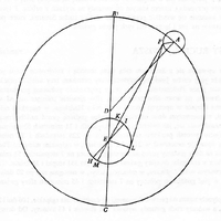 Po prawej: model ruchu Wenus wewnątrz orbity Ziemi ABG. Styczne do orbity Wenus z pozycji Ziemi G wyznaczają maksymalne wschodnie i zachodnie odchylenie (elongację) Wenus od Słońca. Środek orbity Wenus D wędruje po małym kółku DNM wewnątrz obydwu orbit. Środek orbity Ziemi znajduje się w punkcie C, Źródło: De revolutionibus
