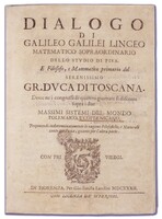 Pierwsze wydanie dzieła Galileusza, w którym autor porównuje teorię geocentryczną Ptolemeusza z teorią heliocentryczną Kopernika, opowiadając się za tą drugą. Tekst przyjmuje formę dialogu, nawiązując tym samym do wzorców antycznych. Podzielony na cztery dni, w ciągu których trzech dyskutantów omawia kwestię związane z ruchem dobowym i rocznym Ziemi oraz teorie pływów, którą Galileusz, błędnie zresztą, uznał za dowód na ruch Ziemi. -