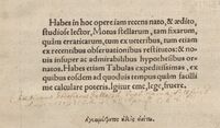 Fragment odwrocia karty tytułowej pierwszego wydania De revolutionibus z przekreślonym ręką matematyka Jana Brożka tekstem nieakceptowanej przedmowy do dzieła Kopernika oraz komentarzem: Tota ista praefatio cancellata est in exemplari Heilspergensi imo et in Braunspergensi w egzemplarzu z Biblioteki Jagiellońskiej sygn. Cim. 8288