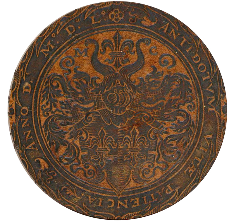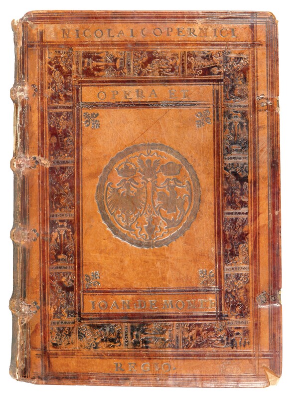 Przyjrzyjmy się zatem najstarszym oprawom, wykonanym bezpośrednio po ukazaniu się De revolutionibus w druku. Jak już nadmieniono, w naszych zbiorach posiadamy pięć lub może sześć takich woluminów, dziś znajdujących się w: Bibliotece Jagiellońskiej (Cim. 8436), Bibliotece Uniwersyteckiej w Toruniu, Bibliotece Kórnickiej, Bibliotece XX. Czartoryskich w Krakowie czy wreszcie w Bibliotece PTPN w Poznaniu, a także (o ile potwierdzi się przypuszczenie o XVI–wiecznej proweniencji oprawy) w Bibliotece Uniwersyteckiej we Wrocławiu (sygn. 411395). Do najlepiej zachowanych i najpiękniej dekorowanych należą – wspomniane już wcześniej – dwie oprawy z bibliotek Krakowa (BJ, Cim. 8436; Biblioteki XX. Czartoryskich). Obie wykonane zostały – o czym również napomknięto – w warsztacie krakowskiego introligatora Jerzego Moellera. Zarówno tom królewski, jak i będący niegdyś własnością Melchiora Krupki okrywają deski obleczone brązową skórą cielęcą. Dekorację ich górnych okładzin stanowią m.in. superekslibrisy: w pierwszym wypadku omówiony już królewski z orłem Jagiellonów, w drugim zaś superekslibris Krupki z monogramem M C i tekstem motta: ANTIDOTVM VITAE PATIENCIA ANNO D. M.D.L. Środki zwierciadeł dolnych okładzin wypełniają złocone napisy SIGISMVNDI // AVGVSTI // REGIS POLO// NIAE MONV//MENTVM i MELCHIORIS // CRVPEK MONVMEN//TVM oraz w obu wypadkach data 1551.