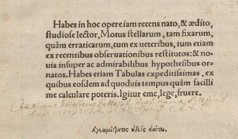 I wreszcie na koniec, warto wspomnieć o ciekawym w tym względzie woluminie będącym w posiadaniu Towarzystwa Naukowego Płockiego. Wprawdzie tom ten pozbawiony jest niemal zupełnie jakichkolwiek komentarzy, zawierając jedynie kilka zaznaczeń tekstu w postaci kropek układających się jakby w wierzchołki trójkątów oraz rozciągniętej między nimi zakrzywionej linii w kształcie litery „S”, które spotykamy na marginesach kilku stron foliału, to jednak na tle interesującego nas zbioru zasługuje na wyróżnienie. Otóż na karcie czwartej wstępu, na marginesie, zamieszczono trudną do pełnego odczytania notkę: hasce lineas Tribunal Inquisitionis […]uticae delere jussit sub Pontificatu Urbani VIII, która wskazywała na przeznaczony do usunięcia tekst, zgodnie z dekretem wydanym w następstwie wpisania w 1616 r. dzieła Kopernika na Indeks ksiąg zakazanych.