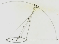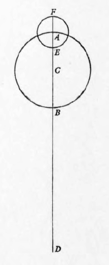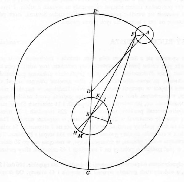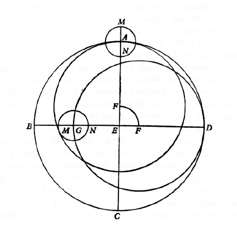 Starożytny (z lewej) i Kopernikowski (z prawej) schemat ruchu Księżyca. Środek orbity Księżyca F w modelu starożytnym obraca się w wokół środka Ziemi E w przeciwną stronę niż środek epicyklu Księżyca MN. W rezultacie odległość Księzyca w kwadrach (linia BD) jest dwa razy mniejsza niż w nowiu i pełni (linia AC). W modelu Kopernika (na rysunku nie zachowano skali) z dwoma epicyklami, zaadaptowanym od Ibn Asz-Szatira, D faktycznie wskazuje pozycję Ziemi. Średnica tarczy Księżyca w tym modelu zmienia się w zakresie ok. 29-37 minut łuku, o wiele bliżej rzeczywistości niż w modelu Ptolemeusza, Źródło: De revolutionibus.