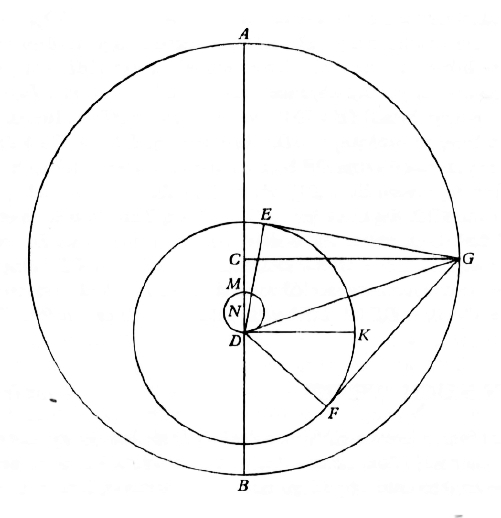 Po lewej: model ruchu Saturna z jednym epicyklem i ekscentryczną orbitą względem środka orbity Ziemi E. Środek orbity Saturna znajduje się w punkcie D. Na rysunku nie zachowano skali, Źródło: De revolutionibus Po prawej: model ruchu Wenus wewnątrz orbity Ziemi ABG. Styczne do orbity Wenus z pozycji Ziemi G wyznaczają maksymalne wschodnie i zachodnie odchylenie (elongację) Wenus od Słońca. Środek orbity Wenus D wędruje po małym kółku DNM wewnątrz obydwu orbit. Środek orbity Ziemi znajduje się w punkcie C, Źródło: De revolutionibus