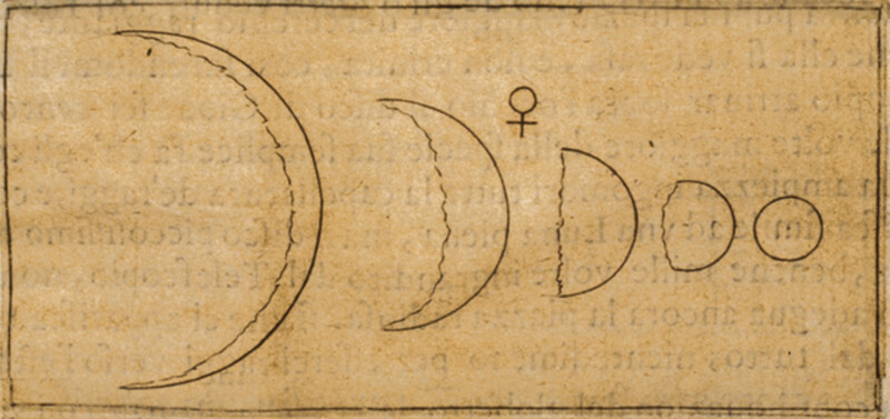 Po lewej oryginalne rysunki faz Wenus sporządzone przez Galileusza. Po prawej schematyczny obraz powstawania faz w modelu geocentrycznym (z lewej) i heliocentrycznym. W modelu geocentrycznym nie ma szansy zobaczyć obserwowanych przez Galileusza kwadr i pełni Wenus.
