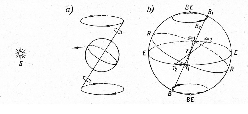 W księdze pierwszej De revolutionibus Kopernik wprowadza precesję nieśmiało, jako bardzo niewielką różnicę tzw. trzeciego ruchu Ziemi, ruchu nachylenia, od okresu rocznego. Wprowadza tam ten przeciwny do ruchu rocznego obrót osi Ziemi, tak jakby tkwiła ona w sztywnej, „kryształowej” sferze, popychającej ją wokół Słońca. Ruch, który powoduje, że oś Ziemi „tak jakby” pozostaje bez ruchu. Nie wiadomo, czy sam autor jeszcze pozostaje mentalnie niewolnikiem idei unoszących planety sfer, czy też w ten sposób „popularnonaukowy” zwraca się do wyobraźni czytelnika? Być może jest to jeden z dowodów dużego odstępu czasowego pomiędzy obydwiema księgami. W księdze trzeciej bowiem już na wstępie pisze, że „przy zestawieniu mniejszego z większym bardziej stosowne byłoby mówić o nachyleniu równika do zodiaku niż zodiaku do równika” (tłum. S. Oświecimski). Następnie pieczołowicie wyznacza długości roku gwiazdowego i będącego podstawą zmian pór roku – z którymi powinien być zgodny kalendarz cywilny – roku zwrotnikowego. Różnica wynika właśnie z owego „ruchu nachylenia”, w którym oś ziemska raz na blisko 26 tysięcy lat zatacza w przestrzeni stożek, zmieniając położenie bieguna wśród gwiazd i przetaczając równik wokół ekliptyki (zodiaku). Kopernik uwzględnił 30 lat własnych (sic!) oraz innych obserwacji na przestrzeni 1717 lat. Wyznaczony przez niego okres obiegu Ziemi wokół Słońca (rok gwiazdowy) określa na 365 dni, 6 godzin, 9 minut i 40 sekund, pół minuty więcej niż przyjmowany współcześnie. Analizując swoje dane w porównaniu do obserwacji starożytnych, postuluje też po raz pierwszy w historii zmianę wartości kąta nachylenia równika do ekliptyki. Być może wziął pod uwagę błędne pomiary szerokości geograficznej prowadzone przez Domenico Maria Novara (1454–1504), z którym współpracował w Italii. Co do wartości liczbowych, zmiany te jako zbyt wielkie i szybkie nie potwierdziły się, jednak ogólna tendencja została potwierdzona w XX w. w odgrywających rolę w zmianach klimatycznych tzw. cyklach Milankovitcha – opisanych przez serbskiego matematyka i astrofizyka Milutina Milankovića (1879–1958). Rzeczywiste zmiany nachylenia osi obrotu Ziemi mają zakres około 2 stopni i okres około 41 tysięcy lat, ale współcześnie – tak jak zauważył Kopernik – faktycznie maleje.