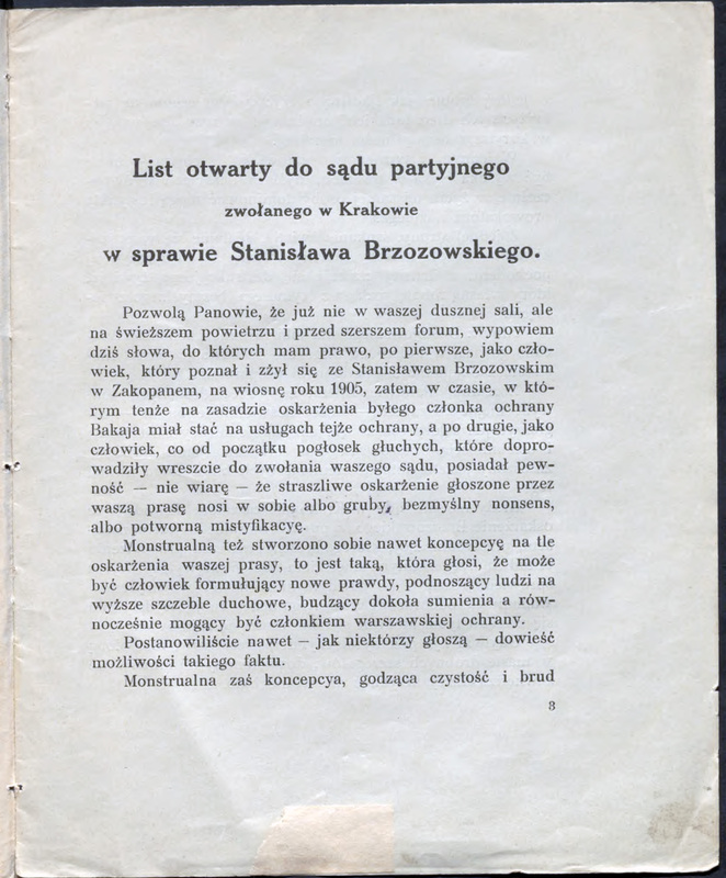 Part of List otwarty do sądu partyjnego zwołanego w Krakowie w sprawie Stanisława Brzozowskiego