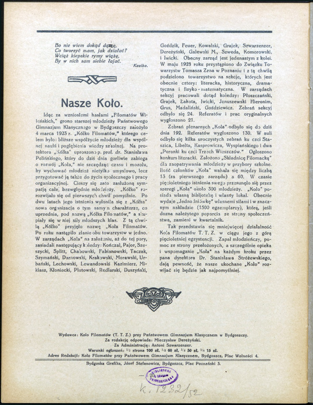 Part of Echo filomatów : jednodniówka wydana przez Koło Filomatów przy Gimn. Klasycznem w Bydgoszczy w 10 rocznicę państwa polskiego r. 1928