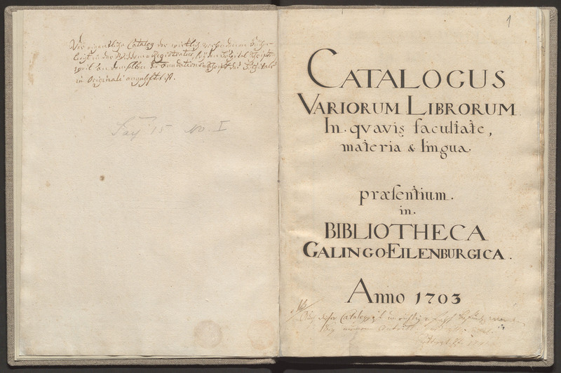 Katalog biblioteki rodziny von Eulenburg z Galin (Gallingen). Został podzieony na 5 działów: „Libri theologici”, „iuridici”, „medici”, „philosophici”, „Miscellanea”, każdy dział posiada osobną numerację