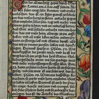 - [72, 1 czysta] karta, sygnowanie A-H8 ; 8° ; Błędne oznaczenie składki A3 jako "B3" ; Modlitewnik nie notowany w bibliografiach. Jedyny znany obecnie egz. (BU UMK) drukowany na pergaminie dla księżnej Doroty, pierwszej żony Albrechta Hohenzollerna, zaliczany do tzw. srebrnej biblioteki. Egz. ręcznie zdobiony bordiurami roślinnymi i zoomorficznymi, ze złoceniami, z przedstawieniami nawiązującymi do bajek Ezopa, z warsztatu Nikolausa Glockendona. Na dodatkowej k. przytytułowej ręcznie malowany herb księżnej ; Zapisy proweniencyjne: D 10 [sygnatura] ; Silberbibl. 27. [sygnatura] ; Ce 1070 Oct. [sygnatura] ; Proweniencje: 1. Dorota (księżna pruska ; 1504-1547). 2. Schlossbibliothek, Königsberg. 3. Königliche- und Universitätsbibliothek Königsberg. 4. Staats- und Universitätsbibliothek zu Königsberg. ; Oprawa: czarny jedwabny aksamit na desce, pozłacane srebrne okucia i guzy, srebrne zapinki i klamry. I poł. XVI w.