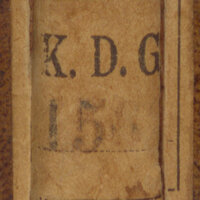 2. Sygnatura na prostokątnej nalepce z czarną ramką umieszczanej u dołu grzbietu, składająca się z liter K. D. G. oraz cyfr arabskich