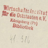 1. Czerwona pieczątka Wirtschaftsinstitut für die Oststaaten e.V. Königsberg (Pr) Bibliothek, sygnatura zapisana granatową lub czerwoną kredką, składająca się z jednej wielkiej litery, krop-ki/ek i cyfr arabskich np. K. 363; K.236. lub bez kropek K 310