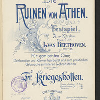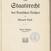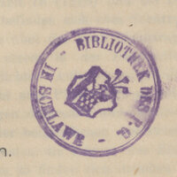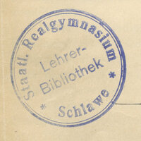 1. Granatowa, okrągła pieczątka: Staatl. Realgymnasium. Lehrer-Bibliothek. Schlawe, sygnatura odręczna zapisana ołówkiem składająca się z litery i liczb arabskich.