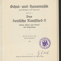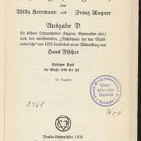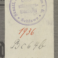 3. Fioletowa, okrągła pieczątka Staatl. Realgymnasium * Schlawe * w środku napis Schüler-Bücherei Sygnatura odręczna zapisana czarnym tuszem, składająca się z liter i cyfr arabskich