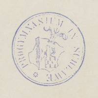 5. Fioletowa, okrągła pieczątka z herbem Sławna, która przedstawia stojącego rybogryfa z szachownicą zamiast ogona. Po prawej stronie godła znajduje się nurt rzeki Wieprzy („stronę prawą i lewą godła herbowego określa się zawsze z punktu widzenia osłaniającego się tarczą”). Na pieczątce widnieje napis BIBLIOTHEK DES P. G. IN SCHLAWE