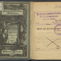 4. Przekreślona prostokątna, czarna pieczątka: Schülerbibliothek. Kgl. Realgymnasium Schlawe Pomm. Zug Nr……….. Klass. Nr. O III 85. ; nalepka na przedniej wklejce C. 14.b