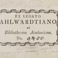 - 1. Exlibris donacyjny: Ex legato ahlwardtiano ad Bibliothecam Academicam. No. 9400. ; 2. sygnatura na ostatniej wyklejce: Ob 412 AW