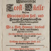 Musicalische Trost-Quelle. Auß den Gewöhnlichen Fest- und Sontags-Evangelien auch andern Biblischen Sprüchen geleitet, Gesprächs-weiser, mit 4. Sing-Stimmen, benebenst 2. oder 4. Violn (nach Belieben) sampt dem General-Bass