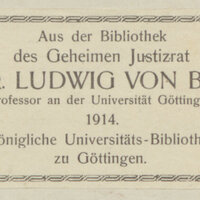 - Prostokątna naklejka z informacją o proweniencji książki z biblioteki profesora prawa Ludwiga Bara (1836-1913), którego zbiory po śmierci trafiły do zbiorów Biblioteki Uniwersyteckiej w Greifswaldzie.