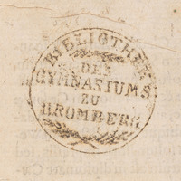- Pieczątka okrągła: 1. "Bibliothek des Gymnasiums zu Bromberg" ; 2. sygnatura [A I α 162.] ; 3. nalepki (biała + żółta) na grzbiecie z sygnaturą.