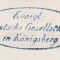 - Pieczątka owalna wkolorze niebieskim: Königl: Deutsche Gesellschaft in Königsberg. Grzbiet książki - sygnatura K.D.G. 1579.