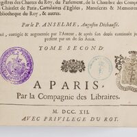 Histoire Généalogique Et Chronologique De La Maison Royale De France... - okrągła pieczątka "BIBLIOTEKA PECZARSKA", owalna pieczątka: "PIECZĘĆ XIĘGOZBIORU CIECIERSKICH", pieczątka herbowa z herbem Pilawa i napisem SCUTUM OPPONEBAT SCUTIS -