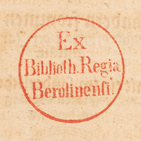 - 1. Pieczątka okrągła (tusz czerwony) „Ex Biblioth. Regia Berolinensi.” ; 2. Ekslibris donacyjny „Bibliotheca Regia Berolinensis. Dono Friderici Wilhelmi IV Regis Augustissimi D. V. Nov. MDCCCL. Ex Bibliotheca B. M. Hartw. Gregorii De Meusebach.” ; 3. Sygnatura F 9260 ; 4. Wklejony na ostatniej wyklejce wystający kartonik z sygnaturą.