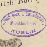 - Owalna pieczęć fioletowa: Staatl. Gymn. u. Oberrealschule Musikbücherei Köslin