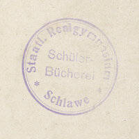- Pieczątka kwadratowa: Schülerbibliothek Realgymnasium Schlawe Pomm z nr sygn. Pieczątka okrągła Staatl. Realgymnasium Schüler-Bücherei. Schlawe. Nr sygn. Do[?] 106