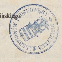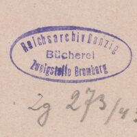 - Pieczątka na stronie tytułowej: Bibljoteka Kalksteinów. Pluskowęsy. Prawy góry róg strony tytułowej: sygnatura Archiwum Państwowego w Bydgoszczy, na dole strony tytułowej pieczątka i sygnatura bydgoskiego oddziału Archiwum Rzeszy w Gdańsku