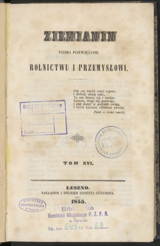Ziemianin : pismo poświęcone rolnictwu i przemysłowi. R. 1855
