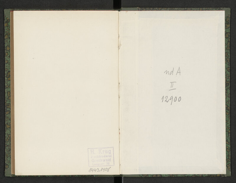 Schleswig-Holsteinisches Liederbuch - wyklejka tylnej okładziny i sasiadujaca strona z pieczatką - pieczątka prostokątna: H. Krug Buchhinderei Greiswald Langestr. 72