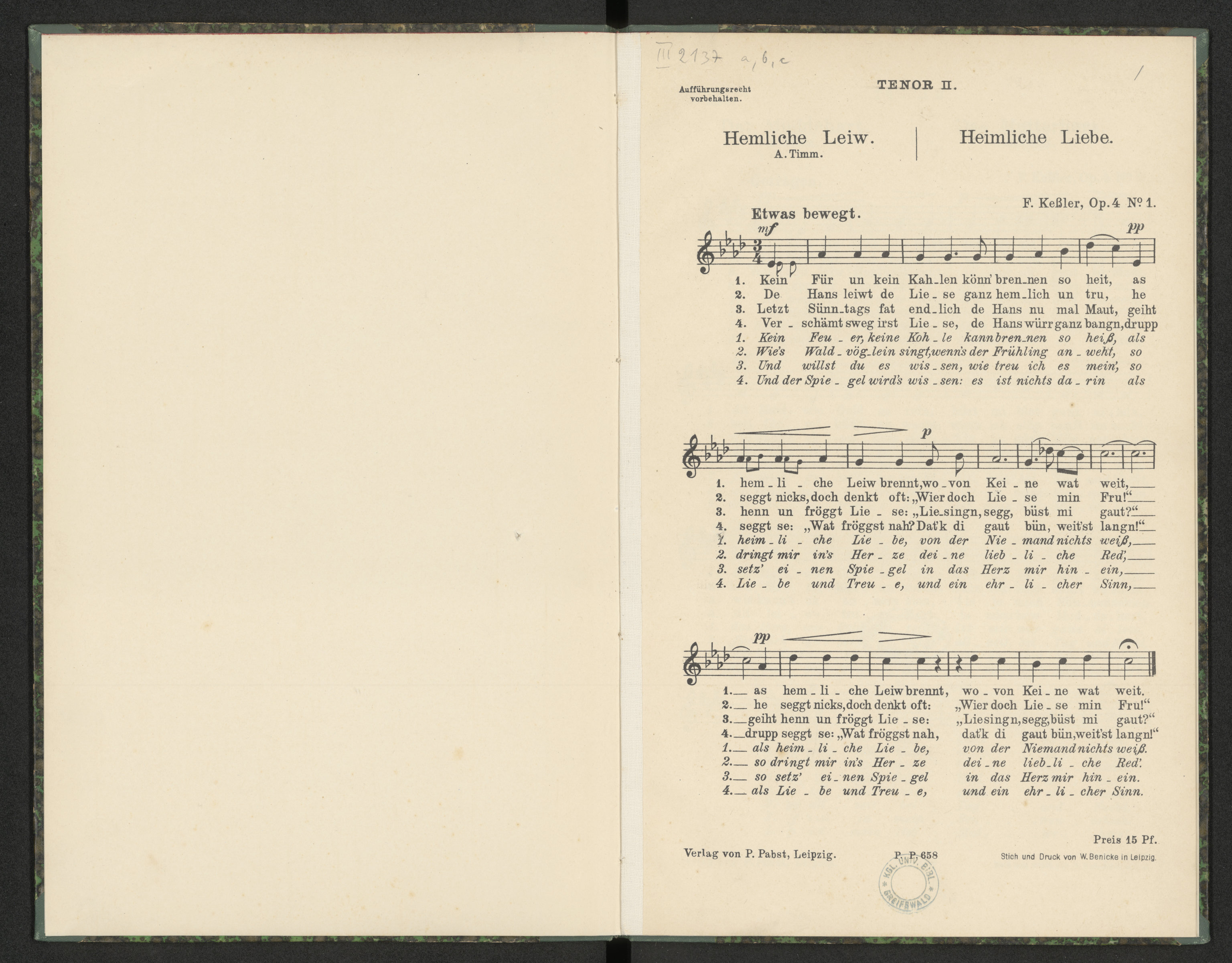 Hemliche Leiw = Heimliche Liebe Op. 4 No. 1[Tenor II] - str. [1] z tekstem muzycznym - pieczątka okrągła: KGL. UNIV. BIBL. GREIFSWALD