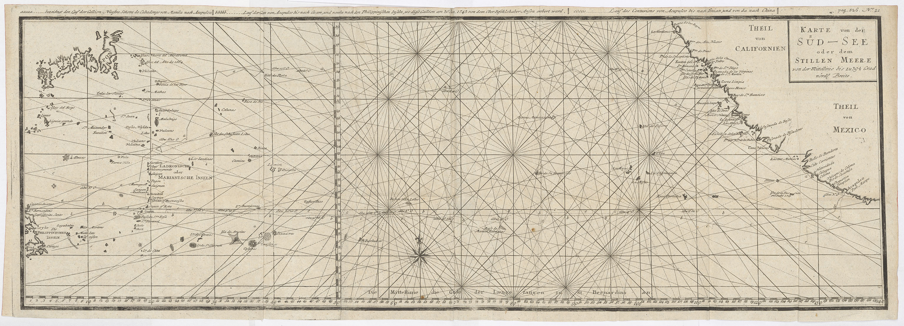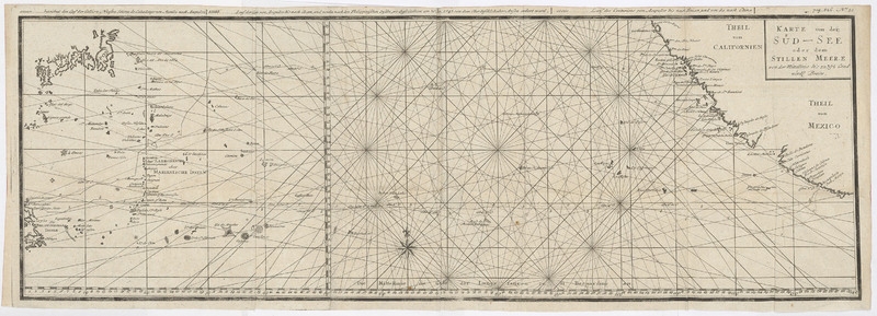 Part of [Zbiór map z książki "Des Herrn Admirals, Lord Ansons Reise um die Welt, welche er als Oberbefehlshaber über ein Geschwader von Sr. Großbritannischen Majestät Kriegsschiffen, die zu einer Unternehmung in die Südsee ausgeschickt worden, in den Jahren 1740, 41, 42, 43, 44 verrichtet hat : aus dessen Aufsätzen und Urkunden zusammengetragen und unter seiner eigenen Aufsicht an das Licht gestellet"]