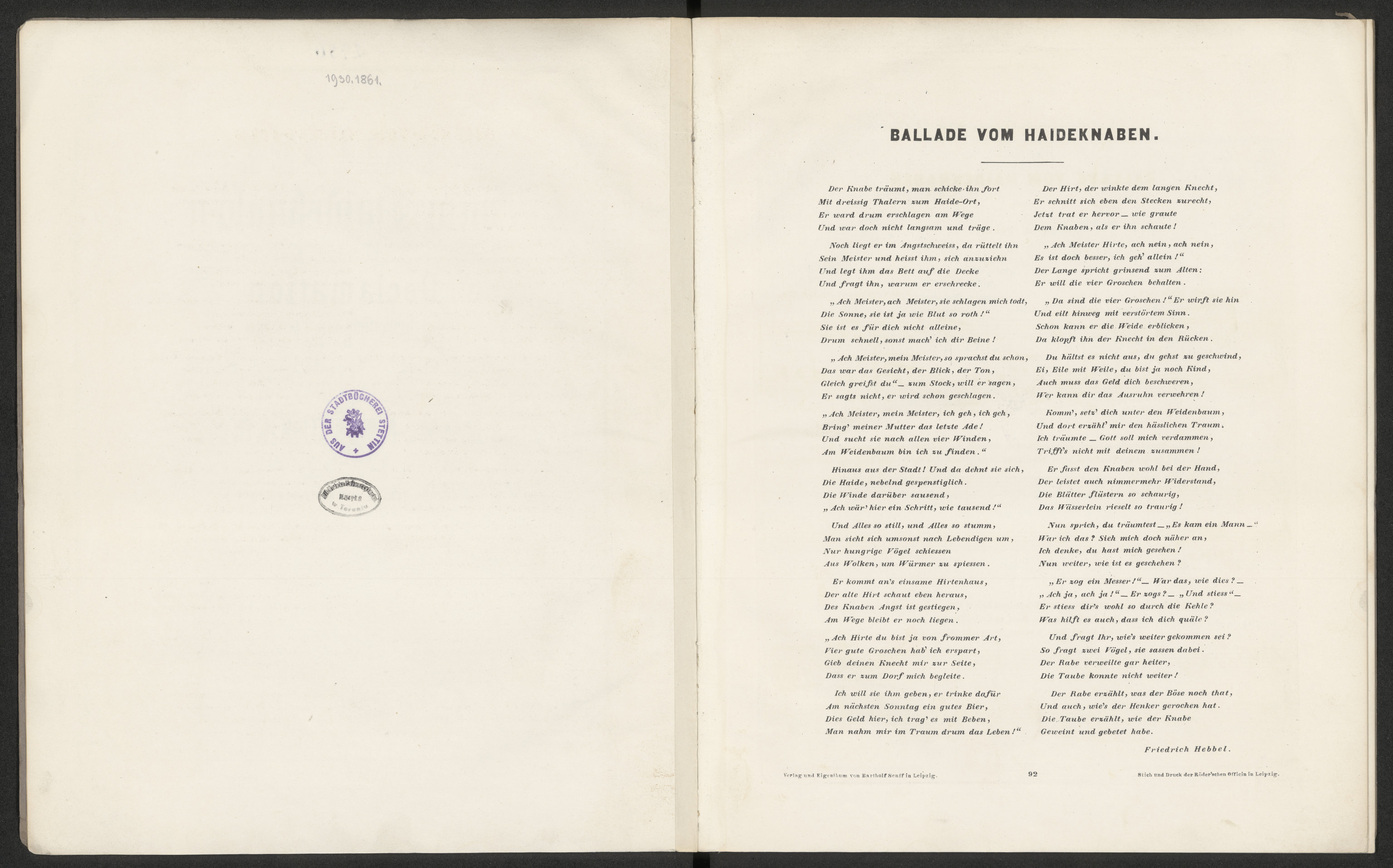 Ballade vom Haideknaben von F. Hebbel für Declamation mit Begleitung des Pianoforte componirt und Herrn Carl Debrois von Bruyk : op. 122 - karta tytułowa verso