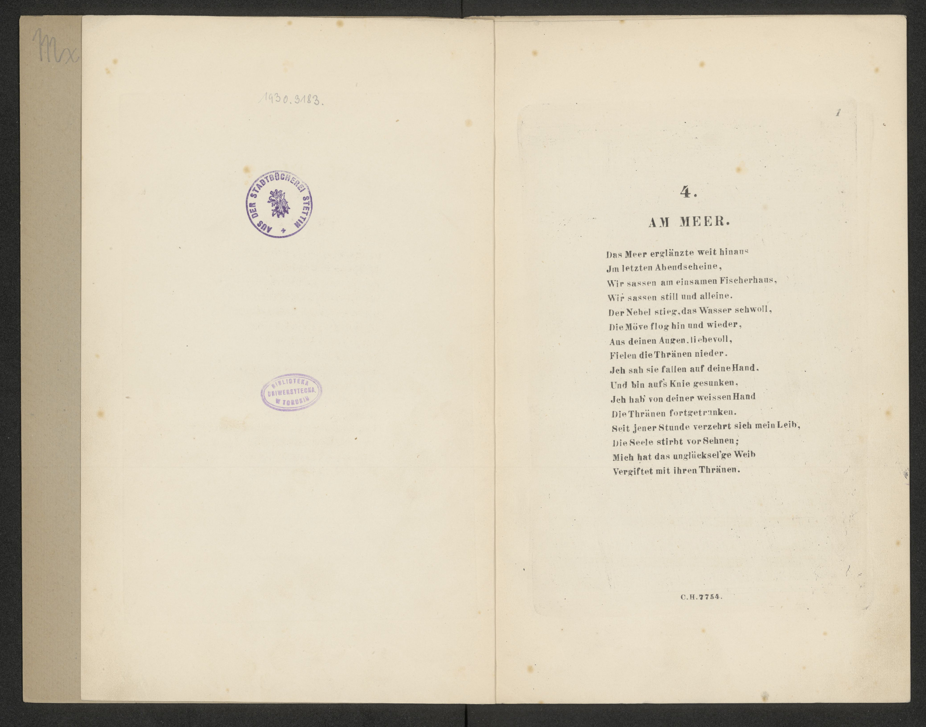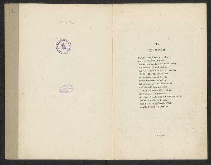 Am Meer. Lied aus Fr. Schubert's Schwanengesang für das Piano Forte - karta tytułowa verso - okrągła fioletowa pieczątka: Aus der Stadtbücherei Stettin