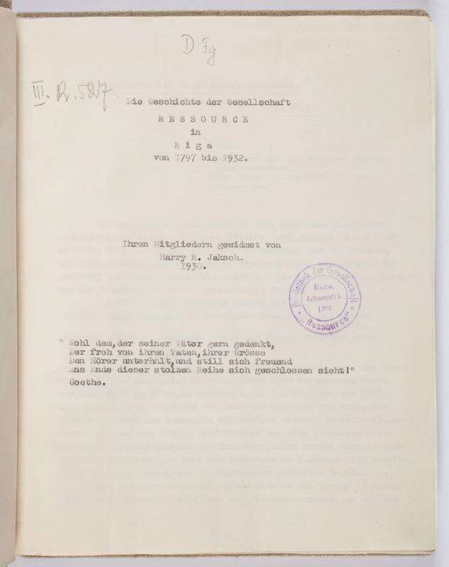 Part of Die Geschichte der Gesellschaft Ressource in Riga (1797-1932)