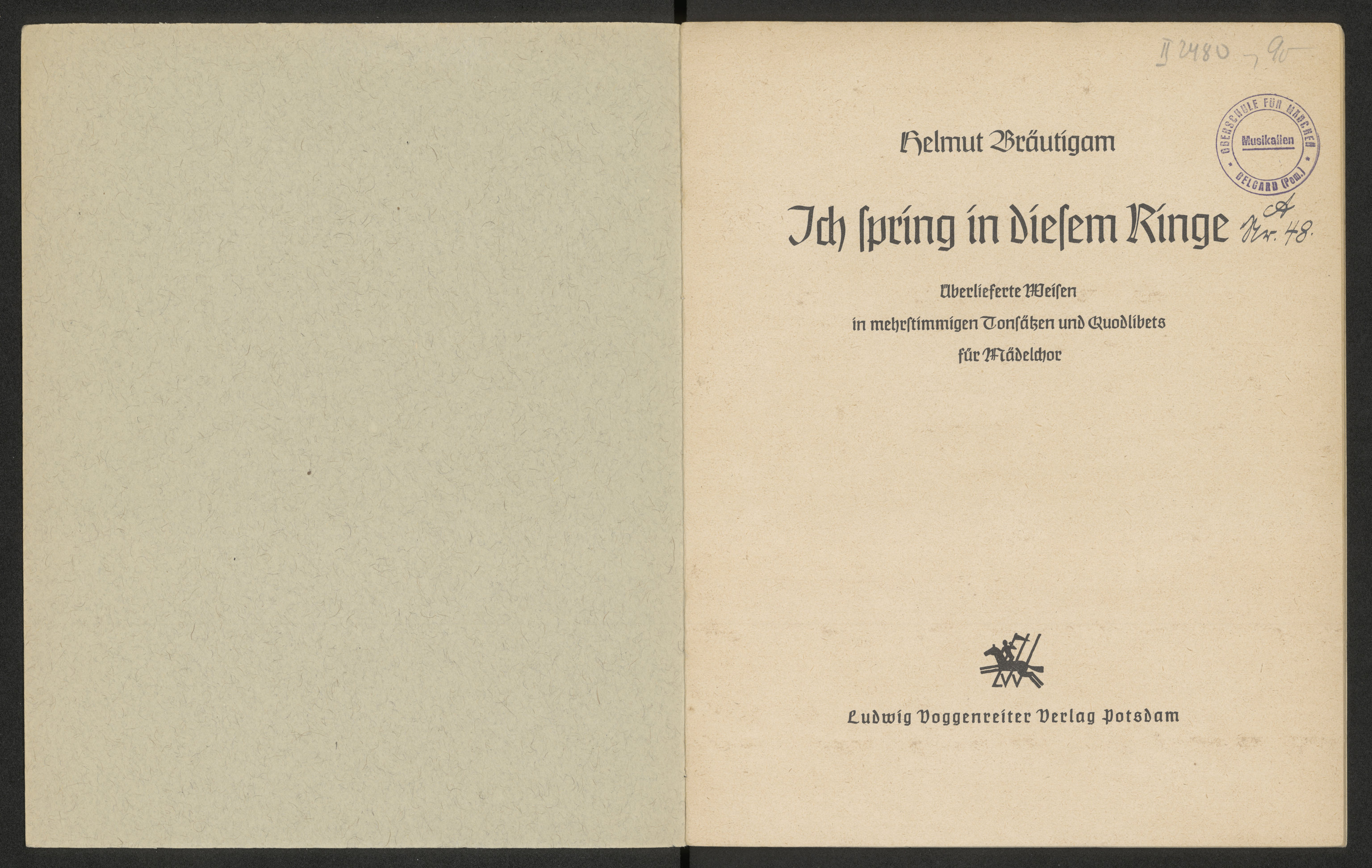 Ich spring in diesem Ringe. Überlieferte Weisen in mehrstimmigen Tonzätzen und Quodlibets für Mädelchor - strona tytułowa z okrągłą fioletową pieczątką: Oberschule Für Mädchen. Musikalien. Belgard (Pom)